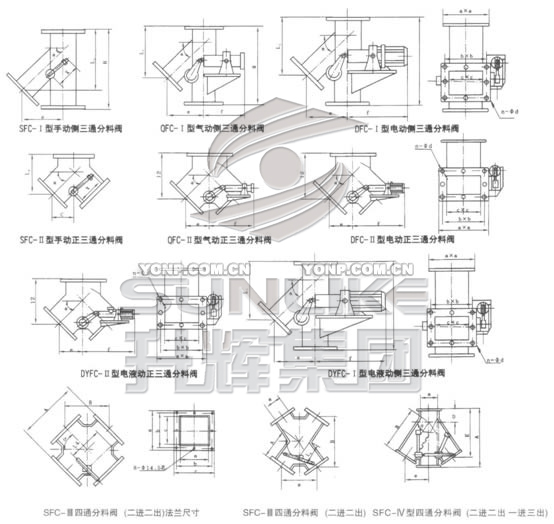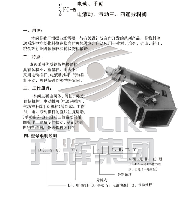 三通分料阀又叫三通溜子,主要由阀体,阀轴、阀板、曲柄机构、电动推杆(电液动推杆、气动推杆或手动机构等)组成。工作时,电液动、气动推杆直线往复运动,(手动由外力)通过曲柄带动阀轴、阀板做一定角度的摆动,从而达到控制物料流量方向,分送物料的目的。广泛应用于建材、冶金、矿山、轻工、粮食等行业固体颗粒和粉状物料输送。